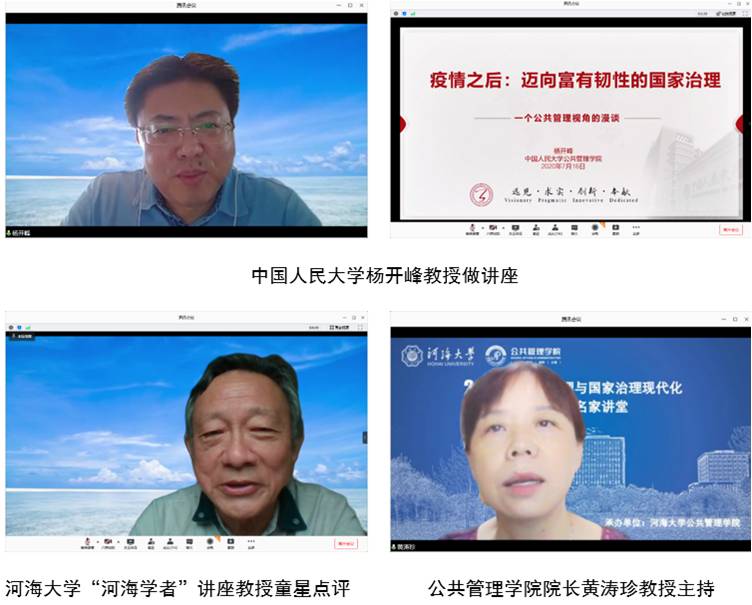 7月31日,“应急管理与国家治理现代化”云端系列名家讲堂第四讲如期举行。中国人民大学开云kaiyun官网院长、全国公共管理专业硕士(MPA)教育指导委员会秘书长、中国管理现代化研究会公共管理专业委员会副理事长、中国机构编制管理研究会副会长、中国行政管理学会常务理事、美国国家行政科学院院士杨开峰教授以《迈向富有韧性的国家治理》为题,为河海师生带来了一场精彩的学术报告。南京大学社会风险与公共危机管理研究中心主任、开云kaiyun官网“河海学者”讲座教授童星特邀点评。开云kaiyun官网院长黄涛珍教授主持报告会。近300名师生认真聆听了报告。