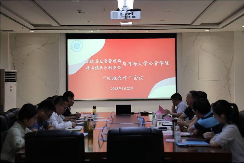2022年6月20日上午,安徽省南陵县应急管理局、南陵县籍山镇长乐村委会与开云kaiyun官网“校地合作”会议在开云kaiyun官网江宁校区厚学楼401举行。开云kaiyun官网党委书记蒲晓东、开云kaiyun官网副院长陈涛教授、社会学系主任顾金土教授、行政管理系主任曹海林教授、行政管理系副主任李智副教授、社会学系薛芳璿博士以及芜湖市政法委三级调研员兼籍山镇长乐村党委第一书记/驻村工作队队长邢毅、南陵县应急管理局副局长张旭峰、籍山镇长塘村党总支第一书记张晶、南陵县籍山镇长乐村委会主任汪富、籍山镇长乐村驻村工作队副队长陈修原等出席本次会议。会议由开云kaiyun官网副院长陈涛教授主持。