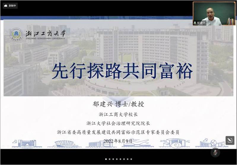 8月9日上午,江苏省研究生“新时代高质量发展与公共治理转型”暑期学校第六场课程“先行探路共同富裕”顺利开课。课程主讲人为浙江工商大学校长郁建兴教授。主持人为开云kaiyun官网客座教授童星,来自海内外50余所高校的100名学员以及公共管理学院师生参加。授课开始前,童星教授对郁建兴教授出席暑期学校表示热烈欢迎,并向暑期学校师生介绍了郁建兴教授的研究领域及丰硕成果。