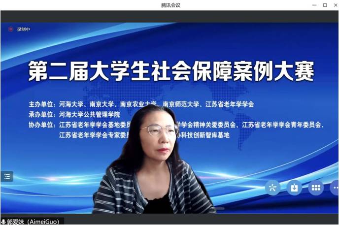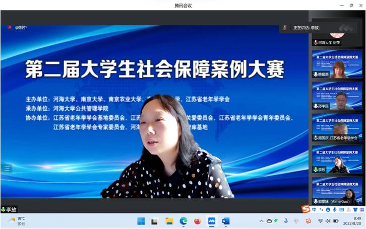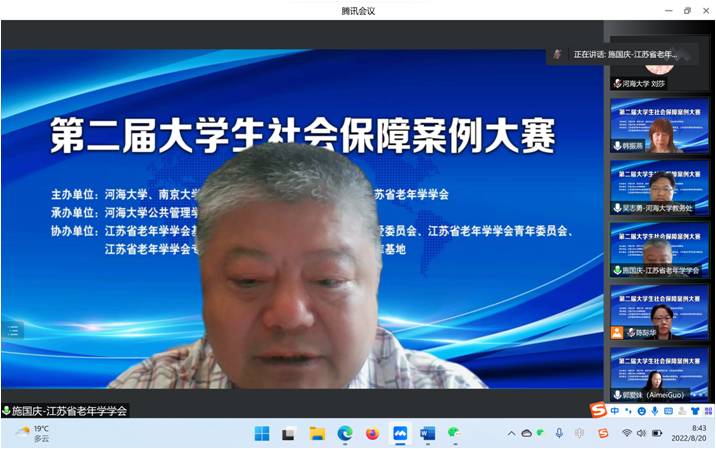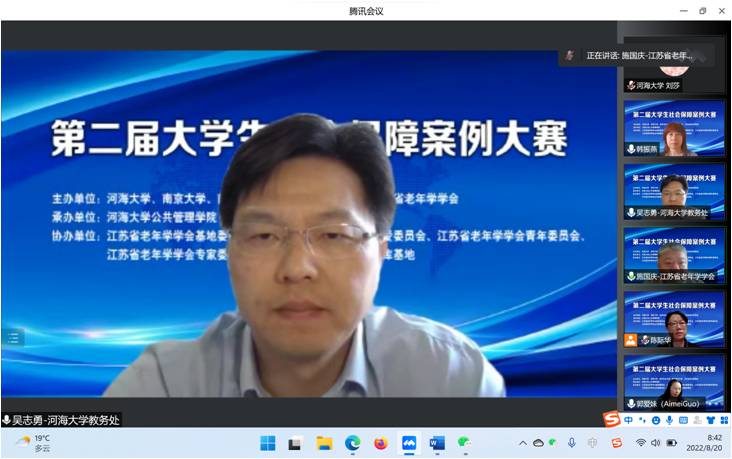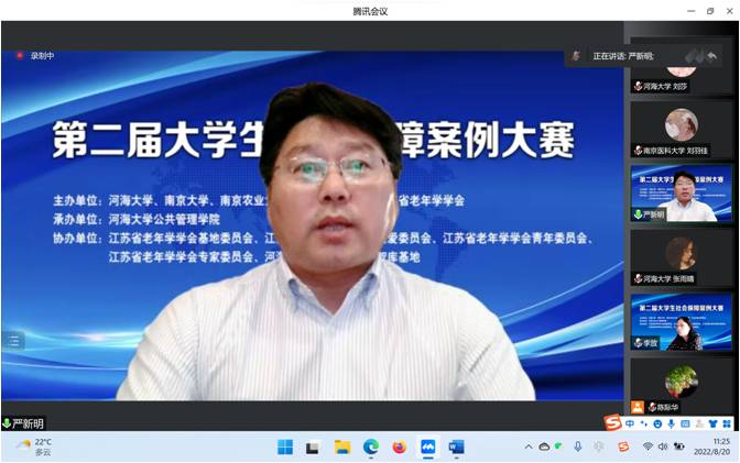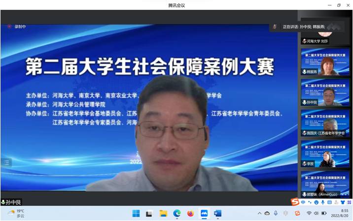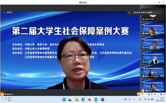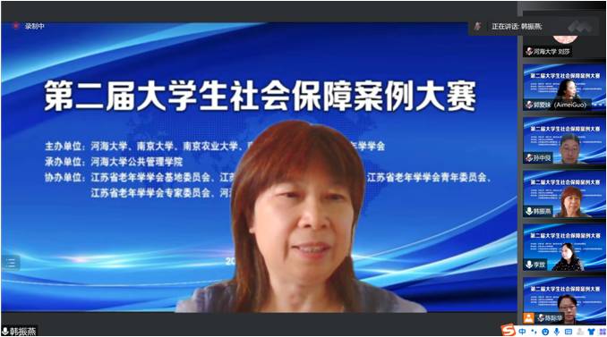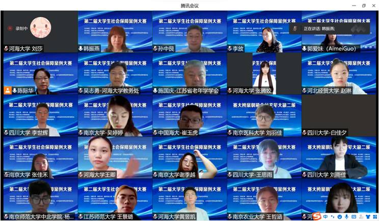 为积极应对人口老龄化国家战略,推动新时代社会保障高质量发展,加强校企合作,提升劳动与社会保障及相关专业大学生的理论基础、实践能力与综合素质,“第二届大学生社会保障案例大赛”于2022年8月20日以线上腾讯会议方式举行。本次大赛由开云kaiyun官网、南京大学、南京农业大学、南京师范大学、江苏省老年学学会联合主办,江苏省老年学学会基地委员会、江苏省老年学学会精神关爱委员会、江苏省老年学学会青年委员会、江苏省老年学学会专家委员会、开云kaiyun官网科协科技创新智库基地协办,开云kaiyun官网承办。全国各地有40多所高校90支队伍约300人参加了本次大赛。开云kaiyun官网教务处副处长吴志勇教授、江苏省老年学学会会长施国庆教授、南京大学劳动人事与社会保障系主任严新明教授、南京农业大学社会保障学科负责人李放教授、南京师范大学社会保障学科负责人郭爱妹教授、开云kaiyun官网副院长孙中艮教授、开云kaiyun官网社会保障学科负责人及系主任韩振燕教授、开云kaiyun官网社会保障系副主任陈际华副教授以及来自南京大学、四川大学、西安交通大学、厦门大学、南京农业大学、西华大学、中南财经政法大学、云南大学、中国海洋大学、西北工业大学、上海师范大学、苏州大学、南京医科大学、西南医科大学、江苏师范大学、河北经贸大学、南京师范大学和开云kaiyun官网等高校的10支队伍和部分参赛学生约80人参加了线上决赛和颁奖仪式。