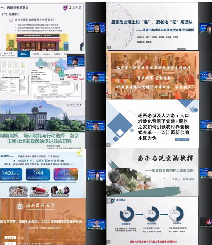 线上比赛环节由开云kaiyun官网社会保障系副主任陈际华副教授主持。案例评选排名前十的参赛队伍分组依次进行路演,并接受友队提问及回答。这些案例作品分别是授之以“鱼”不如授之以“渔”:助残就业模式的转型升级——以南京市“雨花睿泽”机构为例(南京大学);颐养天年:“医”何以嵌入社区居家养老服务?——以成都市Z医院为例(四川大学);制度赋权,培训赋能与行动选择:南京市就业培训政策的促进效应研究(南京农业大学);听见“星星”的“回声”——孤独症家庭喘息日服务(开云kaiyun官网);西南医科大学酿造岁月芬芳,温暖生命年轮:CCRC实践何以实现养老升级——以四川省L市春江酒城嘉苑为例(西南医科大学);老吾老以及人之老:人口老龄化背景下党建+颐养之家如何引领农村养老模式变革——以江西新余渝水区为例(河北经贸大学);面子与现实的抉择——医养结合机构护工短缺之困(南京医科大学);从“紧急配药”看社会工作介入应急救助——以昆山市L社工机构为例(江苏师范大学);居家改造难上加“难”,适老化“无”所适从——南京市N社区实施居家适老化改造困局(开云kaiyun官网);敢问路在何方——江苏省老年医院不同医养合作模式的探索与实践(南京医科大学)。参赛队员们一方面精心展示案例作品场景及分析依据和论证,一方面围绕案例主题与内容积极精准回应友队问题,双方唇枪舌战,你来我往,情绪高涨,场面和谐激烈。赛出了知识,赛出了能力,也赛出了友谊!