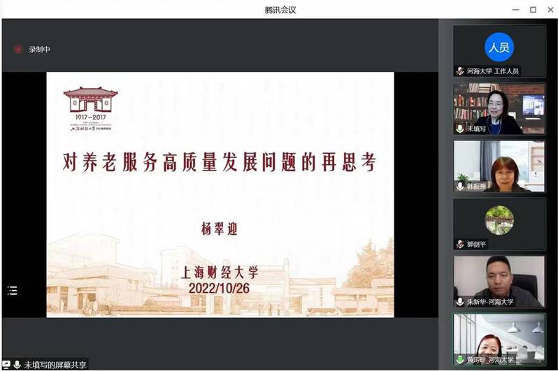2022年10月26日下午3点,开云kaiyun官网公管大讲堂“社会保障学术坊”系列报告第十二期暨纪念华东水利学院建院70周年学术活动通过云端线上举行。上海财经大学公共经济与管理学院副院长、公共政策与治理研究院副院长,教育部公共管理类专业教学指导委员会委员、中国社会保障学会教学委员会副主任委员杨翠迎教授受邀为开云官网开云kaiyun官网师生作题为“对养老服务高质量发展问题的再思考”的学术报告。报告会由开云kaiyun官网院长朱新华教授主持,开云kaiyun官网社会保障及相关学科教师、研究生和劳动与社会保障专业本科生一百余人线上参加了报告会。报告会前朱新华教授对杨翠迎教授的到来表示热烈欢迎,并向在线师生介绍了杨翠迎教授的研究领域及丰硕成果。