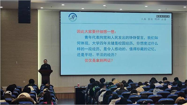 蒲晓东书记将当代青年大学生的学习生活同时代洪流背景相结合,从综合时代背景、完善知识体系、健全人格体系、学会自我管理四个方面为大家讲授了大学期间学生自我发展的世界观与方法论。