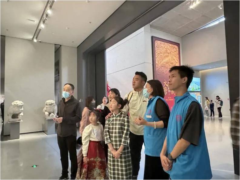 志愿者共分为两组。一组负责在一楼博物馆入口处协助前台查看参观预约码,确保每一位参观者有序地进入博物馆参观,另一组则负责在负一楼的主展厅内进行引导,提高参观者的舒适度。依据不同主题,志愿者被分配到各展厅进行巡视,为参观游客提供指引、讲解服务。志愿者真诚热情,面对尚未预约的游客,耐心帮助其进行网上预约,对游客的问题认真详细地予以解答,面对参观中的不文明行为及时制止,维持展厅内的参观秩序。同时,志愿者积极捡拾展厅地面垃圾,保持展厅的整洁,营造良好的参观氛围。