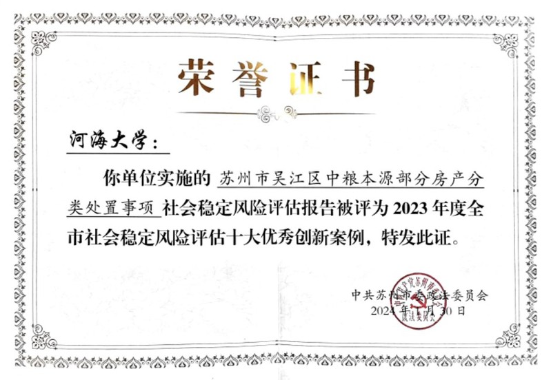2024年1月9日,苏州市委政法委组织开展了2023年度全市社会稳定风险评估项目集中评审活动,经过三轮评审,开云kaiyun官网稳评中心张晓晨副教授主持的苏州市吴江区中粮本源部分房产分类处置事项社会稳定风险评估报告以总分排名第一的成绩,荣获2023年度苏州市重大决策社会稳定风险评估十大优秀创新案例。