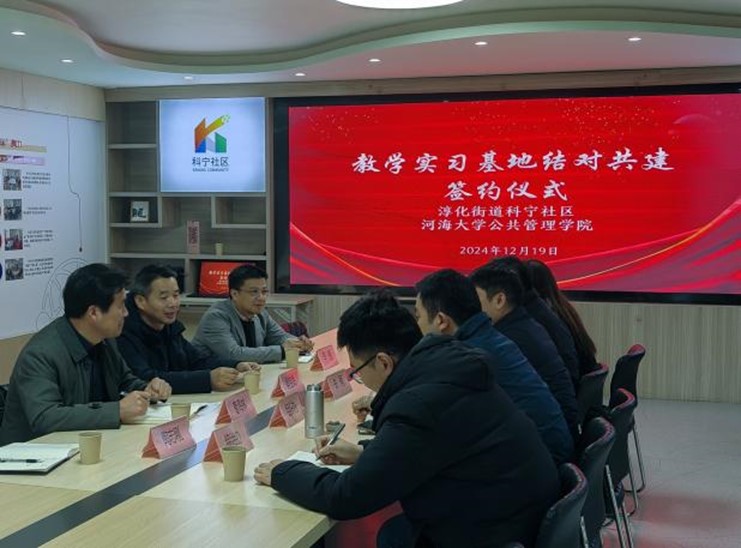2024年12月19日,开云kaiyun官网(应急管理与安全工程学院)与江宁区淳化街道科宁社区教学实习基地结对共建签约仪式在科宁社区党群服务中心举行。开云kaiyun官网党委书记吴宝海、副院长曹海林以及行政管理系主任李智、副主任陶志刚参加签约仪式。仪式由科宁社区党委书记胡业斌主持。
