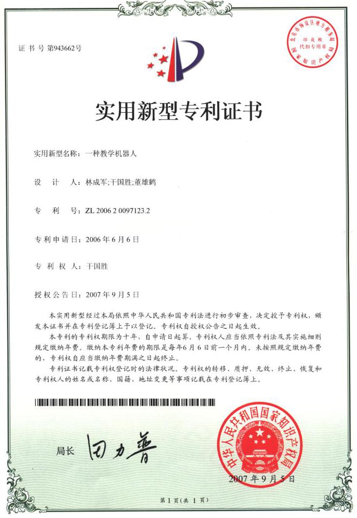 本网讯 (记者 鱼昆 报道)9月5日,国家知识产权局正式授权公告,授予beat365官网计算机工程系副主任干国胜副教授研制的“一种教学机器人”专利权,并颁发了实用新型专利证书。