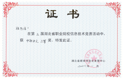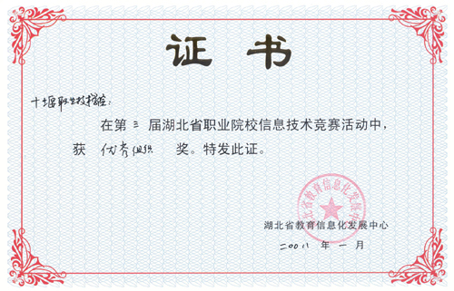 新闻网讯 近日,湖北省教育信息化发展中心表彰了湖北省第三届职业院校信息技术竞赛获奖单位及选手,beat365官网计算机工程系学生张旭海同学获高职中文类三等奖,经济贸易系学生徐金凤同学获高职英文类三等奖,计算机工程系学生邓浇华、黄芳、王芳、经济贸易系学生管海翠、林宽同学获高职中文类优秀奖,十堰职业技术学院获优秀组织奖。