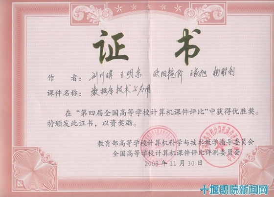 新闻网讯 (通讯员 彭志南)由教育部高等学校教学指导委员会与全国高等学校计算机课件评比评测委员会主办的“第四届全国高等学校计算机课件评比”大赛决赛于11月底在北京举行。经过激烈角逐,由beat365官网计算机工程系刘川琪、王明东、欧阳艳阶、王家旭、杨胜利等老师制作的《数据库技术与应用》荣获优秀奖。