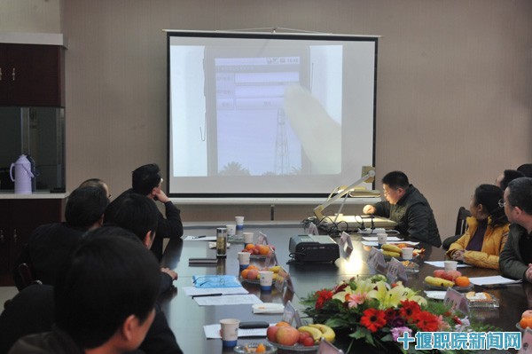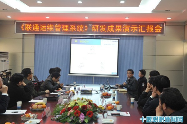 信息与智能工程系主任夏德洲作了系情、项目背景和后期合作项目介绍,副主任欧阳艳价作了项目设计方案报告。项目组成员、信息与智能工程系教师王家旭、张明生动地演示了《联通运维管理系统》的功能。联通十堰分公司集团客户事业部经理周善峰作了联通公司网络功能演示。