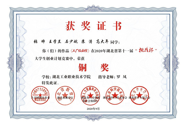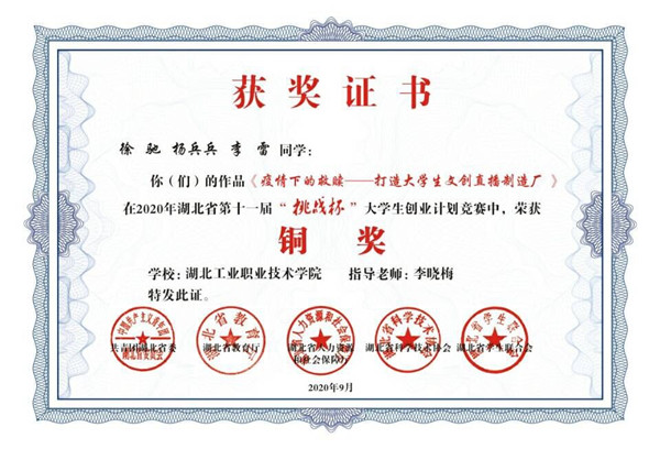 新闻网讯(通讯员李晓梅)近日,第十一届“挑战杯”湖北省大学生创业计划竞赛落下帷幕,beat365官网双创团队斩获两枚铜奖。beat365在线唯一官网2018级电气自动化技术专业张帅学生团队项目《工厂级云控》、beat365在线唯一官网2019级电气自动化技术专业徐驰学生团队项目《疫情下的救赎——打造大学生文创直播制造厂》获大赛铜奖。