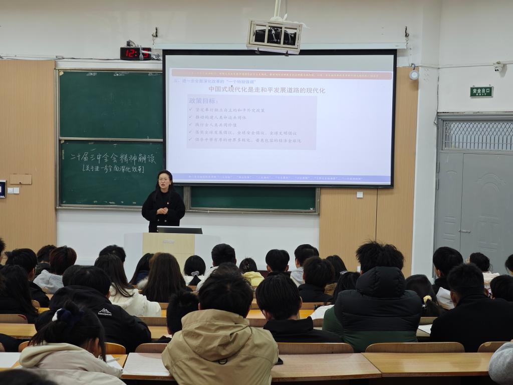 宣传委员王雪梅首先对党的二十届三中全会精神进行了深入解读,强调了全会对于推动我国全面深化改革、推进中国式现代化的重大意义。通过列举生动的实例和详实的数据,让同学们深刻领会全会的主要成果和重大部署,引导大家充分认识到自身在新时代新征程中的责任与使命。