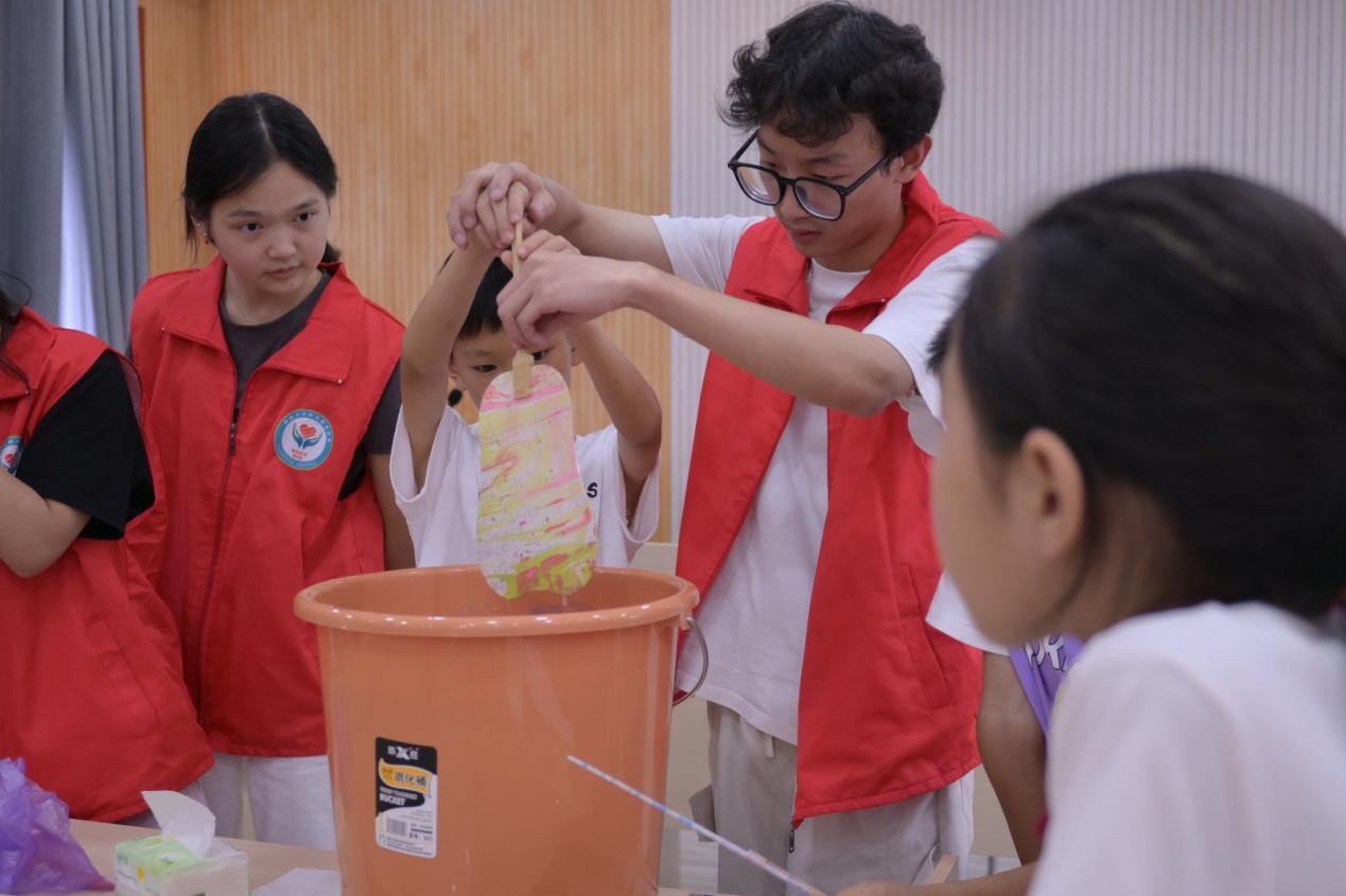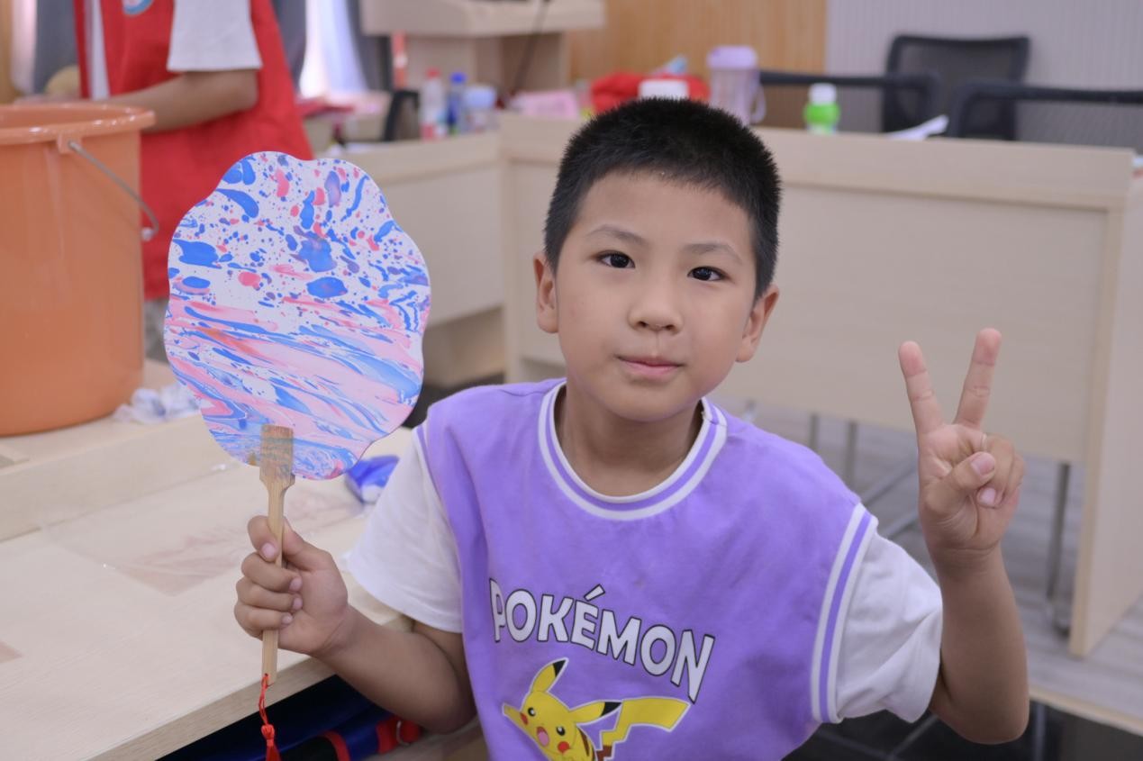 这场非遗体验是“爱心托管班”的特色课程之一。为丰富社区儿童假期生活,电亮青春志愿者服务队提前两周筹备,不仅定制简化版漆扇材料包,还专门培训志愿者掌握基础技法。活动中,志愿者们化身“非遗小老师”,有的手把手教孩子调整漆刷角度,有的帮着把孩子们的创意想法落在扇面上,原本需要精细操作的传统工艺,在耐心引导下变得简单又有趣。