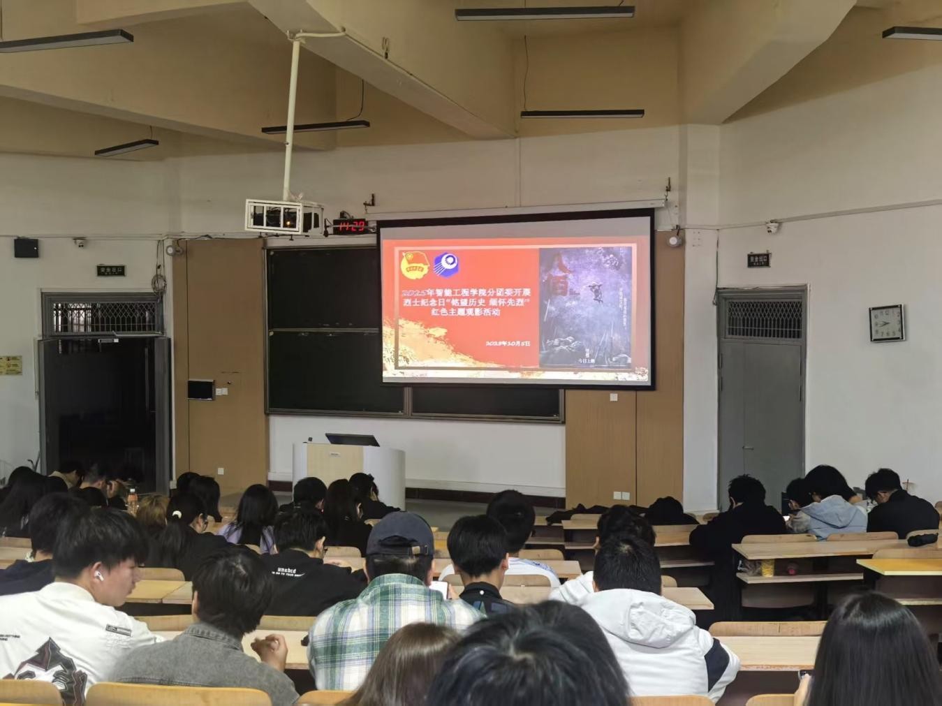 红色观影育新人,光影交织荡豪情。10月5日,分团委在6109教室举行红色观影活动,300余名新生共同观看影片《八佰》。影片通过历史场景和镜头语言,再现战争的残酷与侵略者的暴行,让在场师生深刻感受到和平的来之不易。10月6日,师生共同观看《建国大业》,先辈们运筹帷幄、英勇无畏的形象深深烙印在同学们心中,大家纷纷感怀建国之艰,表示铭记历史,勤奋学习。